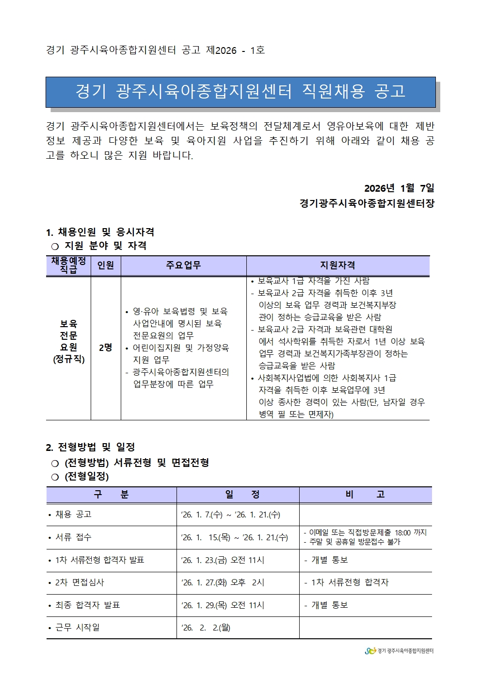 <경기광주시육아종합지원센터> 직원채용공고 2026-1호(보육전문요원)