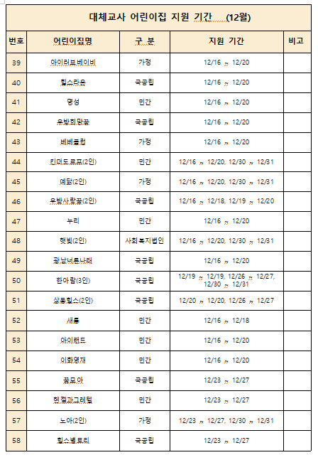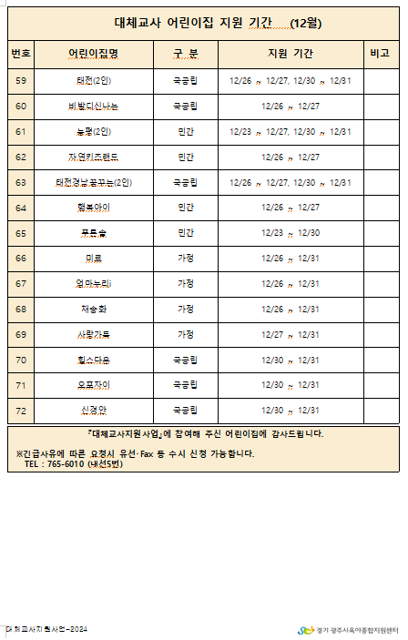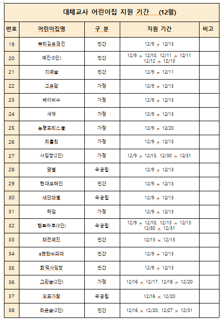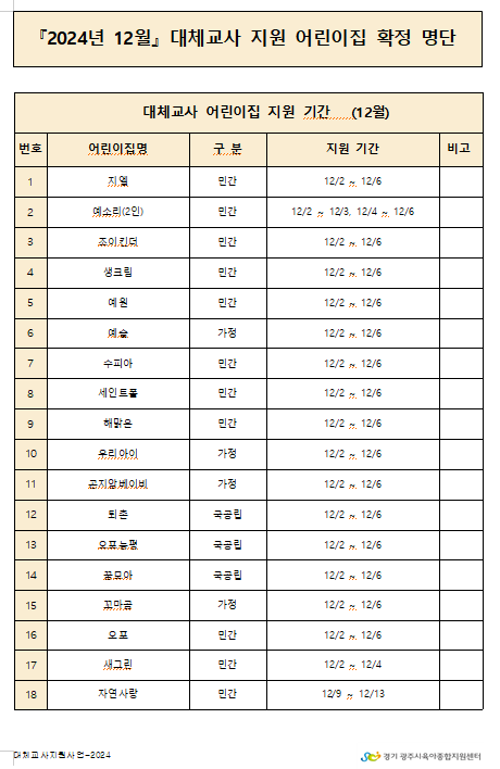 2024년 12월 대체교사 지원 어린이집 확정 명단