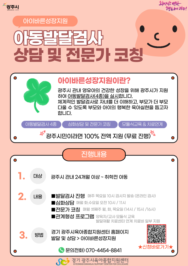 ▶ 광주시 관내 아동 24개월 ~ 취학 전 아동을 대상으로 연1회 아동발달검사 4종을 무료로 지원합니다.
