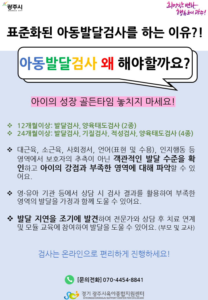 ▶ 광주시 관내 아동 12개월 ~ 취학 전 아동을 대상으로 연1회 아동발달검사를 무료 지원합니다.