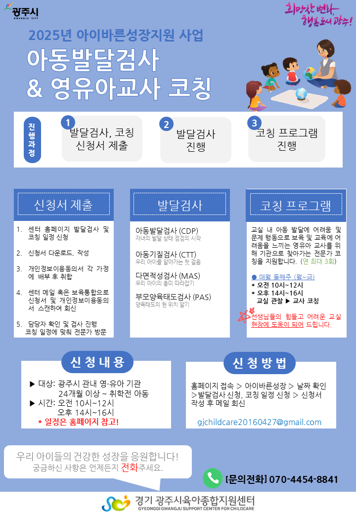 ▶ 발달검사 신청 >> 코칭 일정 신청 >> 신청서 제출 (gjchildcare20160427@gmail.com)