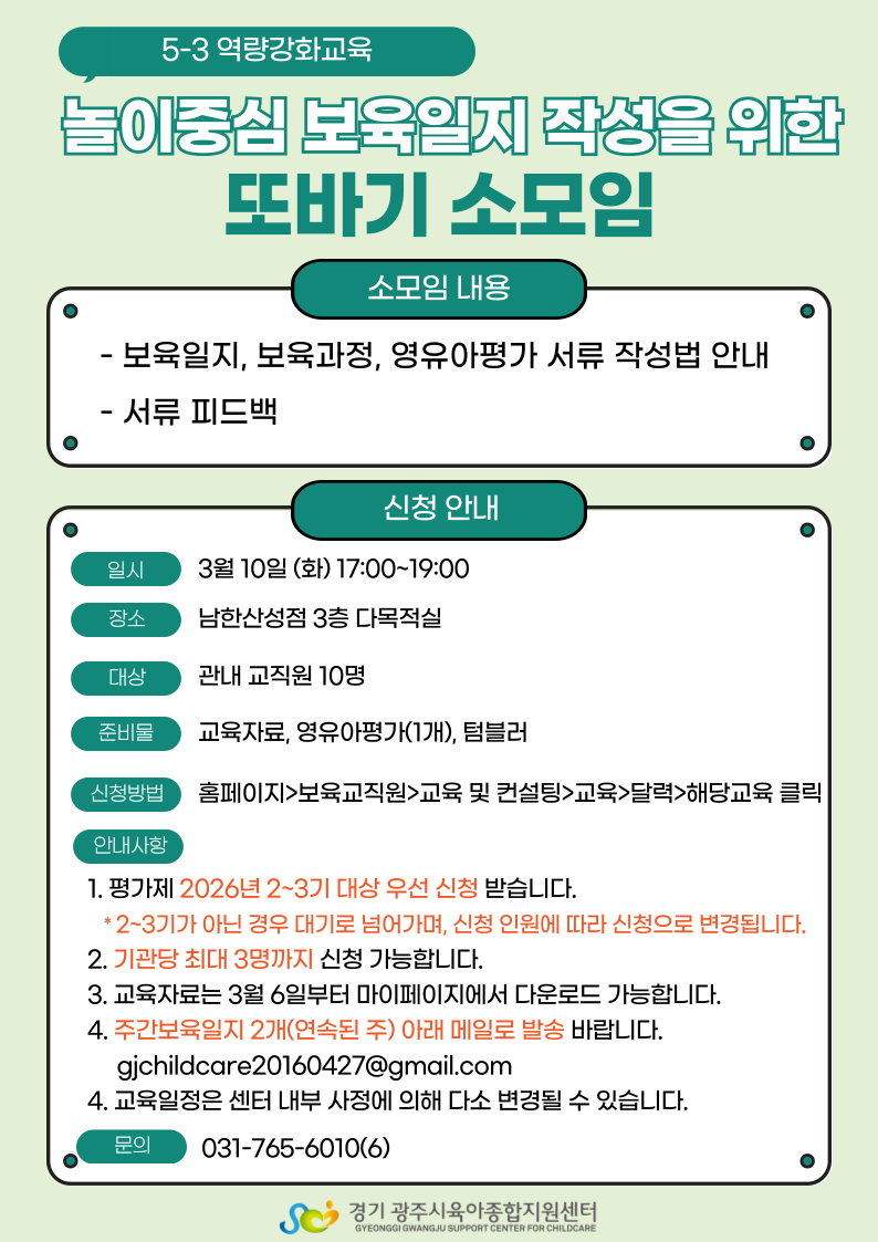 * 보육일지 내용은 함께 공유될 수 있으므로 보육일지 제출시 기관명, 교사명 등은 삭제 후 한글 또는 PDF로 발송 바랍니다.